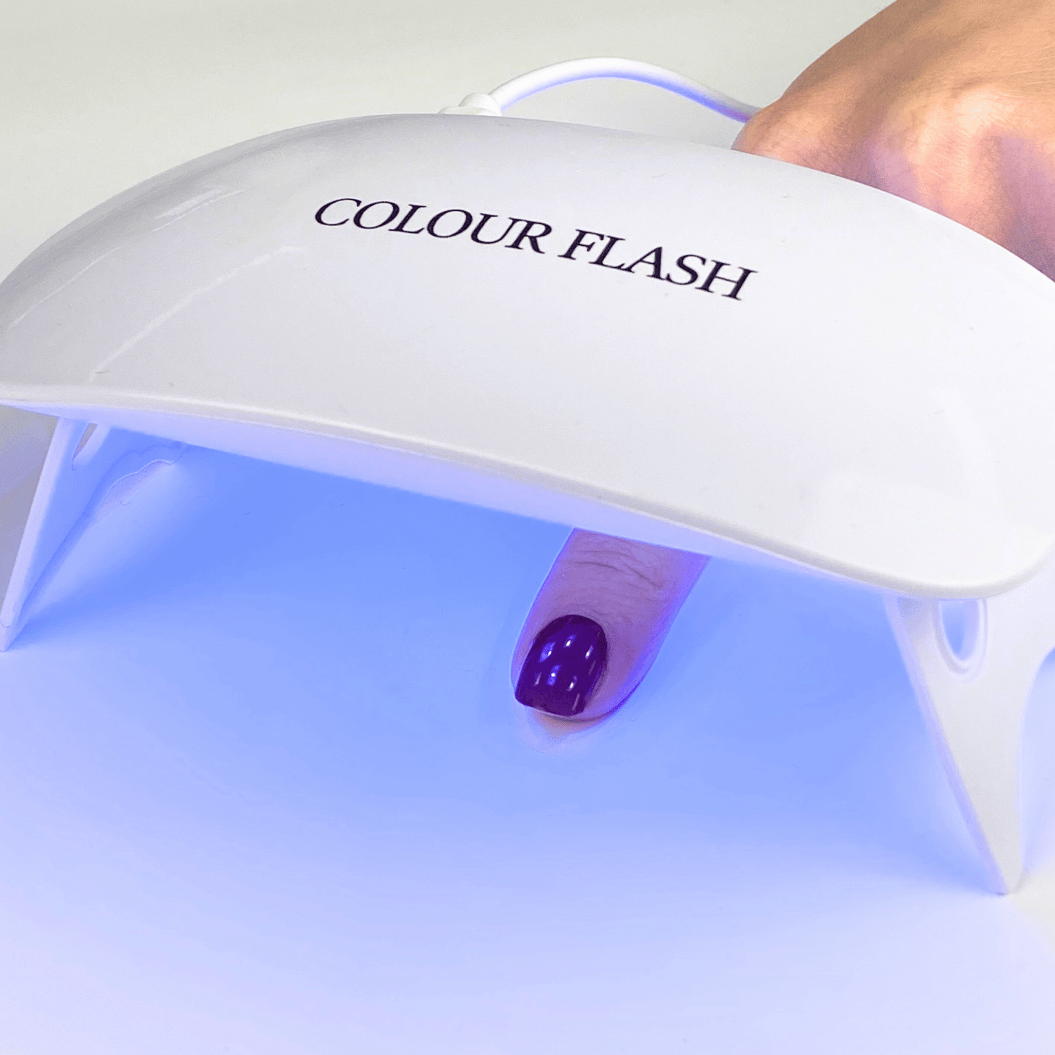 Nun platzierst du deinen Zeige-, Mittel, Ring- und kleinen Finger mittig unter der UV LED Lampe und schaltest sie ein. Warte 1 Minute. Die Colour Flash UV LED Lampe schaltet sich automatisch nach 60 Sekunden ab. Wiederhole den Vorgang mit deinen Daumen.