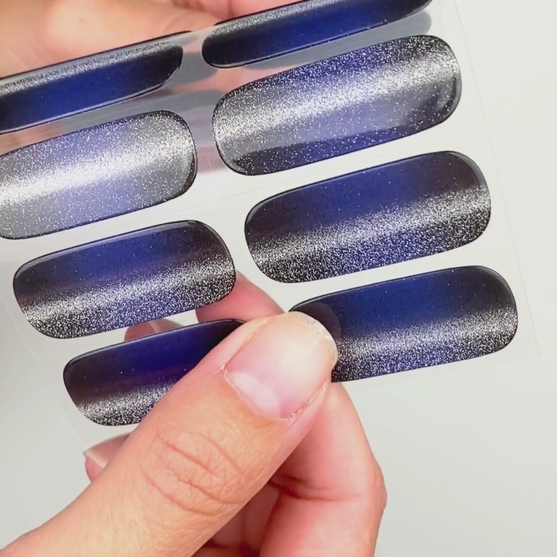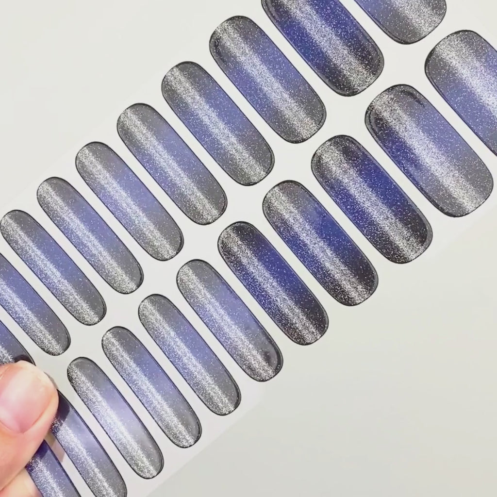 „Midnight Cateye“ ist Bestandteil der UV Gel Kollektion. Dieses auffällige Design zeigt einen Farbverlauf von Schwarz zu Navy, der mit einem beeindruckenden Cateye-Effekt veredelt ist. Diese atemberaubende Kreation sieht auf jedem Hautton schön aus und passt zu nahezu jedem Anlass.