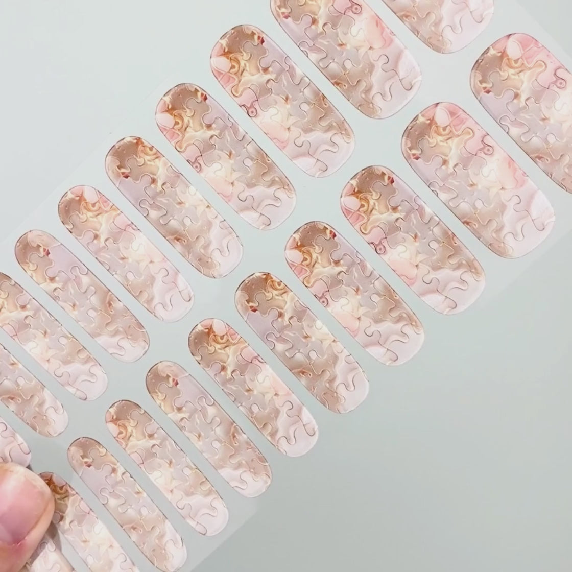 „Pearl Puzzle“ ist Bestandteil der UV Gel Kollektion. Diese zarte Kreation zeigt eine Vielzahl kleiner, perlmuttfarbener Puzzleteile. Diese atemberaubende Kreation sieht auf jedem Hautton wunderschön aus und passt zu nahezu jedem Anlass.